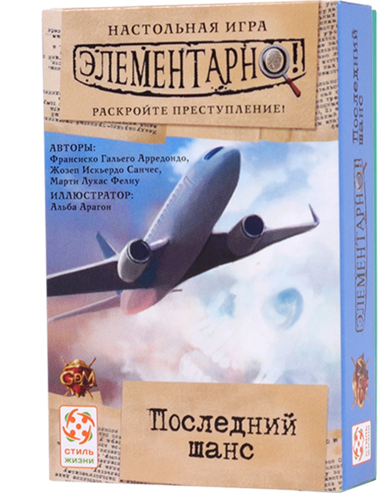 Элементарно! - это кооперативная игра-детектив, в которой вам нужно раскрыть преступление всем вместе при помощи информации на картах. Анализируйте полученные сведения, открывайте нужные карты и сбрасывайте те, которые, по вашему мнению, не имеют отношения к делу. Последний шанс - игра-детектив из серии Элементарно! Самолёт совершил экстренную посадку. Что случилось на борту? Каждая карта содержит факт, показания или улику. Относятся они к делу или поведут вас по ложному следу? Вам нужно понять, что произошло и вычислить преступника. Для Шерлока Холмса это элементарно, а для вас? Уровень сложности - средний.