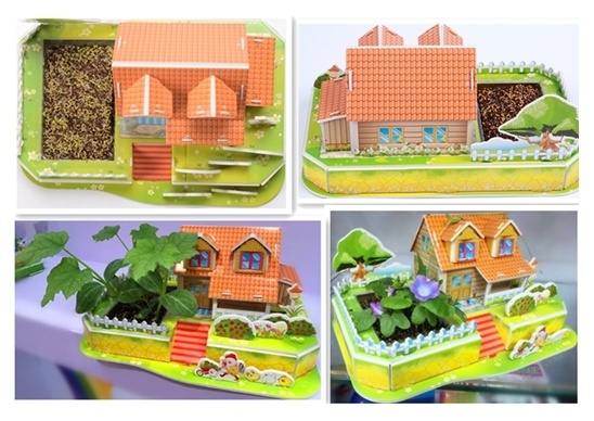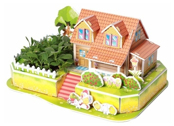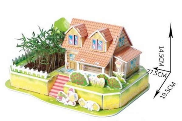 Из деталей 3Д-пазла «Любимый сад» можно собрать красивый дом с мансардой. Дом располагается на небольшой возвышенности, подняться к нему можно по удобной лестнице. Сделать территорию рядом с домом ещё красивее и уютнее можно, вырастив свою собственную клумбу. Для этого в наборе есть семена и специальный грунт. Для полива есть оригинальная лейка.