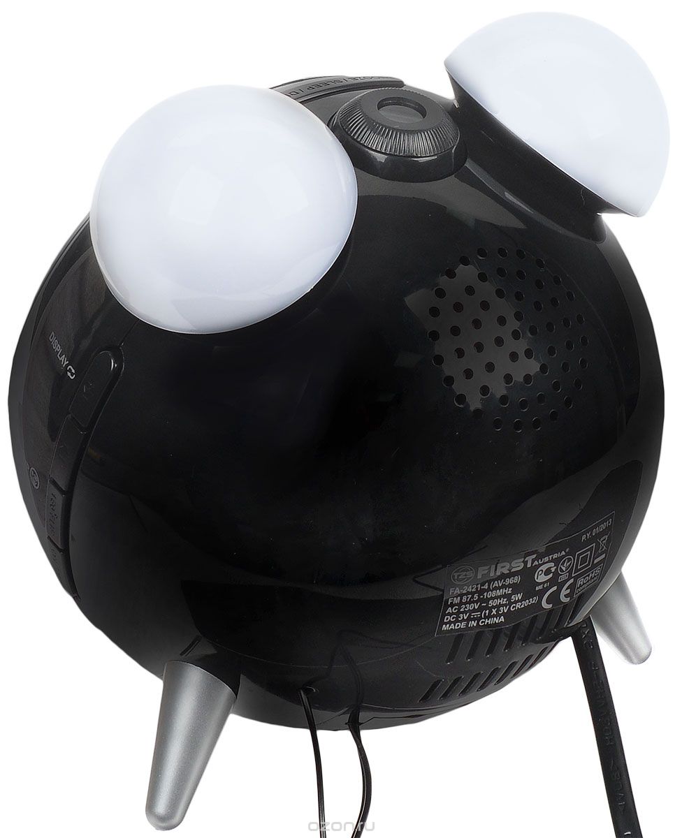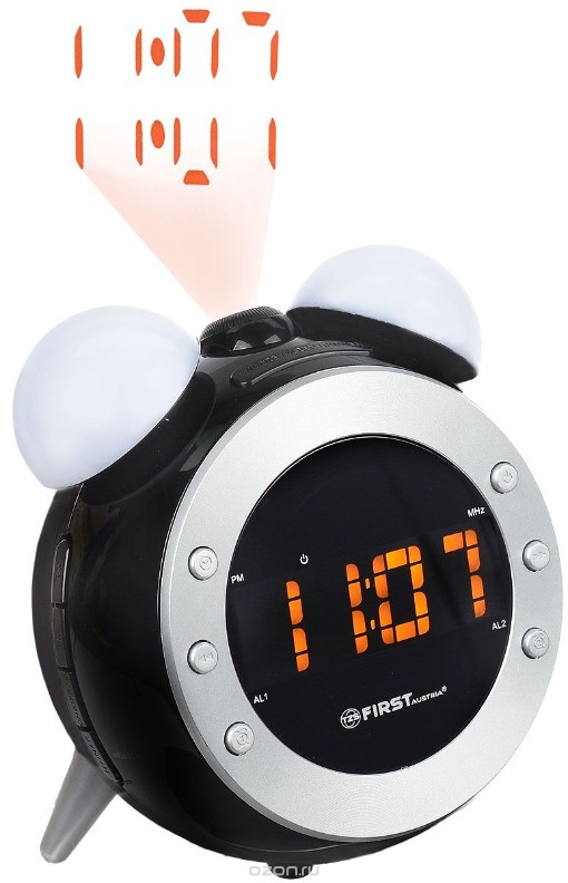 First FA-2421-4 — радиочасы с проектором и LED-дисплеем диагональю 0,8 дюйма. Устройство имеет кварцевый стабилизатор, а также различные дополнительные функции: календарь, контроль температуры, подъем под музыку или звонок. Встроенный проектор с настройкой фокуса может вращаться на 180°. Два будильника — еще одна полезная функция данной модели, которую можно отключать на выходные дни. Вы также можете активировать отложенный сигнал чтобы поспать еще немного времени. Будильник отключится и прозвенит через 9 минут.