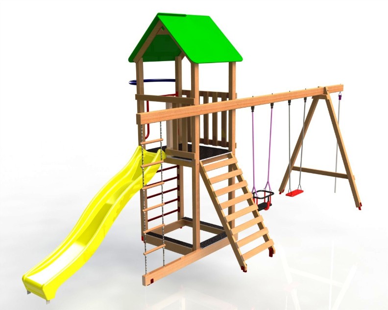 Игровой комплекс предназначен для игровых физических упражнений на открытом воздухе. Комплекс состоит из игровой платформы с горкой и двумя качелями с разными сидениями, песочницы, веревочной лесницы. Детский игровой комплекс отлично развивает у детей координацию, ловкость, укрепляет разные группы мышц рук и спины.