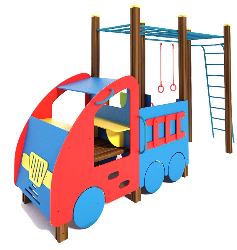 Машинка с гимнастическим комплексом и горкой представляет собой элемент, близкий по функциональным свойствам к игровым комплексам. Машинка включает горку с желобом из нержавеющей стали, гимнастический элемент, лестницу,кольца, рукоход, наклонную доску для лазанья на машинке могут одновременно играть 2-3 детей в возрасте от 3-12 лет.