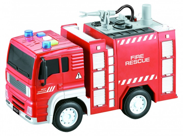 Автомобиль Пожарная машина оснащён подвижными деталями, световыми и звуковыми эффектами, на крыше машины расположены 3 кнопки каждая из которых отвечает за воспроизведение звука запуск автомобиля, звука клаксона и звука сирены, так же на крыше расположены мигающие проблесковые маячки. Машина стреляет водой, резервуар машины заполняется водой и с помощью кнопки через подвижную пушку подаётся струя воды.