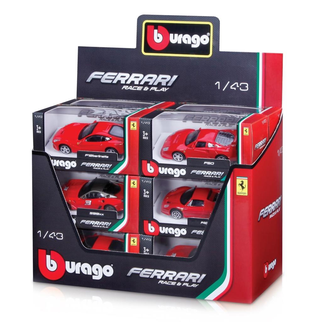 Это набор литых их металла Ferrari, созданный брендом Bburago. В комплекте "Ассорти" находятся 24 автомоделей марки Ferrari, 12-ти видов. Каждая из машинок в комплекте имеет двухцветную окраску. Масштаб автомоделей составляет 1:43. Допускаются к играм для мальчиков от трех лет. Двери и капот цельные, не открывающиеся. На колесах установлены резиновые шины.