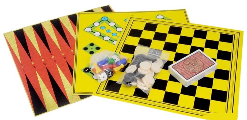 Комплектация3 двусторонних игровых поля (Нарды, Мельница, Лестница, Шашки-Шахматы, Скачки, Кто-Скорее),16 фишек, 15 белых и 15 черных шашек, двойной кубик, 2 простых кубика, колода игральных карт (52 листа)
