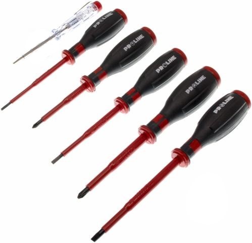Набор диэлектрических отверток Proline предназначен для монтажных и демонтажных работ в среде, разрушающий металл, изоляцию, насыщенной электропроводящей пылью, водяными парами, а также в условиях, когда возможно их непосредственное попадание на изоляцию инструмента в условиях возможного воздействия напряжения до 1000 В.