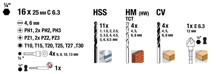 Уникальный набор бит и сверл KWB Promobox Standart в комплект входит 41 шт. Поставляться у пластиковому кейсе с прочиним замком и удобной пласти ковой ручкой, для переноса. Предназначены свёрла для большого спектра задач таких как: работа с деревом, металлом и камнем, шестиугольные торцовые насадки и ещё ассортимент различных бит. Ещё одним плюсом есть это материал держателей и бит который изготовлен из высококачественной хромванадиевой стали, что гарантирует долгий строк службы.