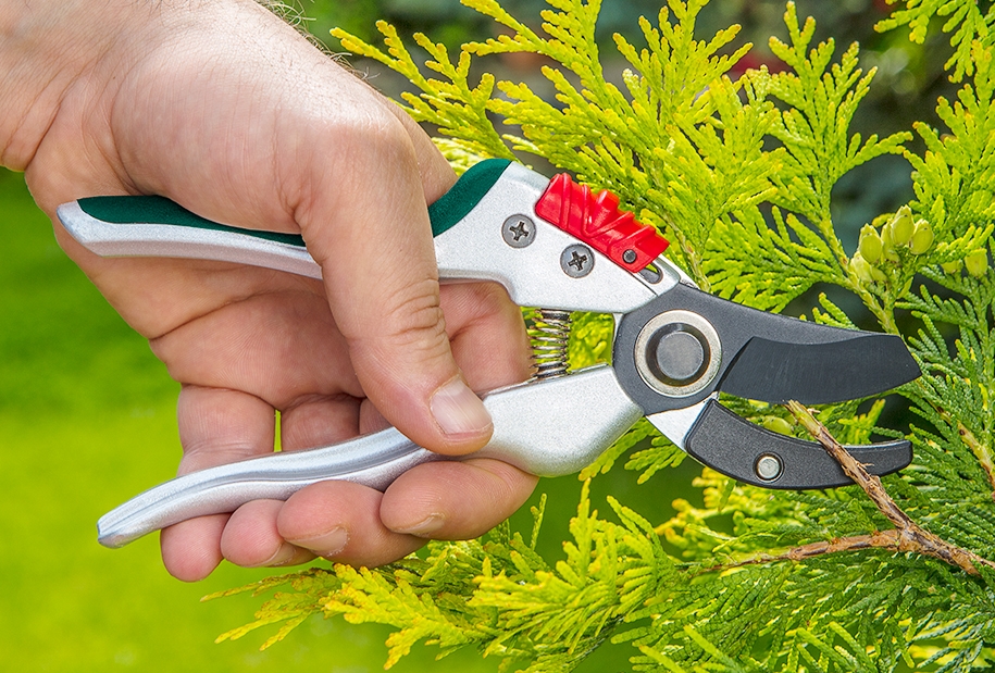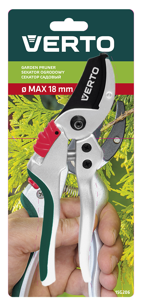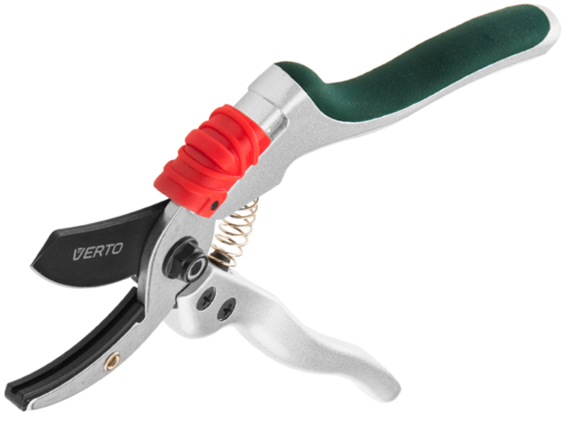 Секатор садовый контактный алюминиевый VERTO, длина 195 мм, диаметр резки до 18 мм. Предназначен для подрезки веток и кустарников. Эргономичный изгиб лезвий на 15° значительно облегчает работу и повышает ее комфорт. Лезвие с тефлоновым покрытием, обеспечивающим защиту от коррозии. Алюминиевый корпус гарантирует прочность инструмента. Блокировка лезвия предотвращает его выдвижение в непредвиденных ситуациях. Эргономичная пластмассовая рукоятка с антискользящим покрытием обеспечивает безопасность и комфорт во время работы.