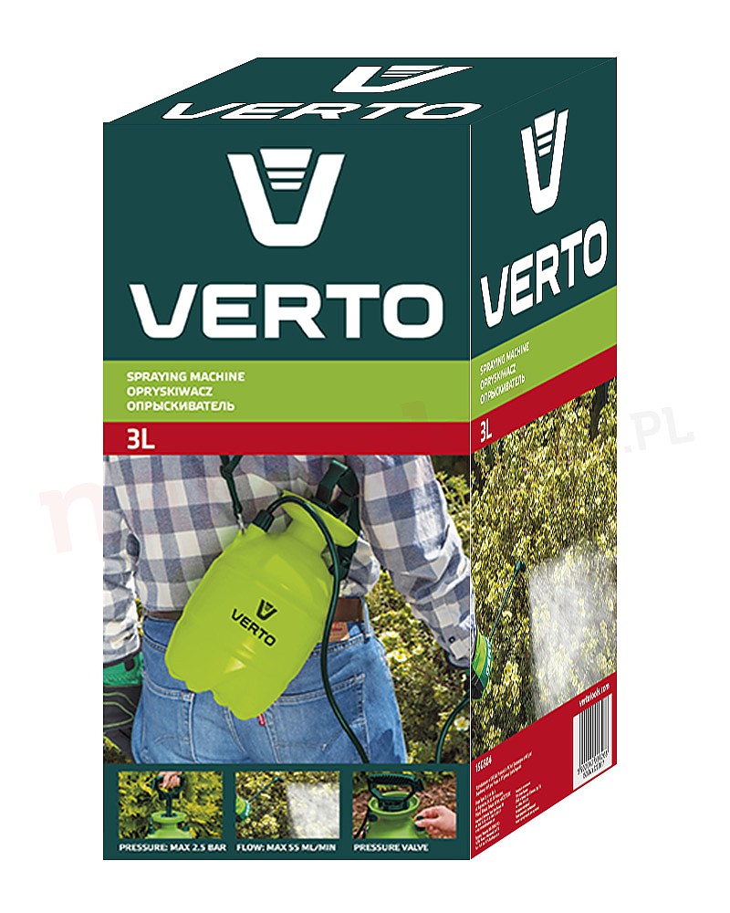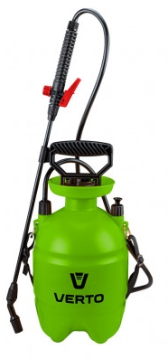 Помповый садовый опрыскиватель VERTO. Рабочее давление 2,5 - 3 бар. Широкая шейка облегчает наполнение бачка. Благодаря дополнительному ремню опрыскиватель можно повесить на плечо, а блокировка струи повышает комфорт работы. Клапан обеспечивает безопасность во время эксплуатации. С опрыскивателем можно работать в диапазоне температур от 0 °C до + 45 °C.