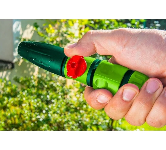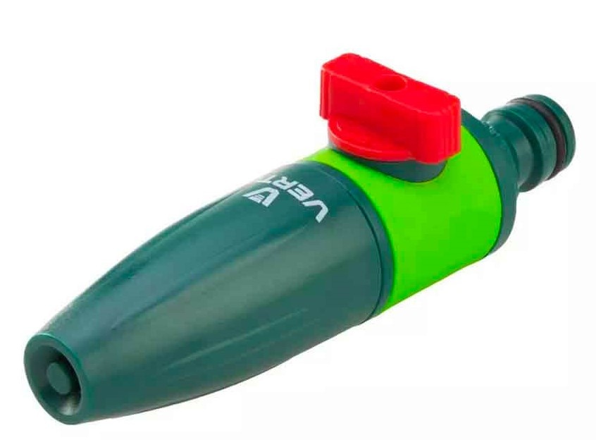 Распылитель Verto 15G700 — это прямой садовый пистолет‑ороситель, выполненный из легкого пластика, предназначенный для подключения к шлангу диаметром 1/2 "– 3/4". Он оснащён регулировкой потока воды: можно плавно менять форму струи — от мягкого распыления до сильной направленной (струйной). Также имеется функция «стоп‑вода», которая позволяет перекрывать поток прямо на самой насадке, без необходимости закрывать кран.