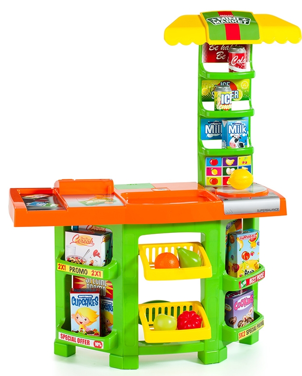 Благодаря этому тематическому игровому набору комната вашего малыша превратится в небольшой, но очень реалистичный супермаркет. В нем будут представлены различные имитации продуктов, поэтому крохам останется лишь распределить, кто станет продавцом, а кто покупателем. Дети с удовольствием станут участниками игры, по сюжету которой один из них станет продавцом супермаркета, а другой его покупателем. В этом им поможет реалистичная игровая конструкция с прилавком, на котором можно разместить все товары из комплекта: фрукты, коробочки и другие.