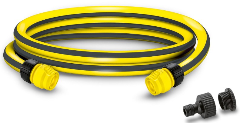 Комплект аксессуаров для соединения тележки или катушки для шланга с водопроводным краном: штуцер для присоединения к крану G3/4 с переходником G1/2 (2.645-006.0), 2 универсальных коннектора, 1,5-метровый шланг 5/8″ PrimoFlex. Подходит ко всем распространенным изделиям.
