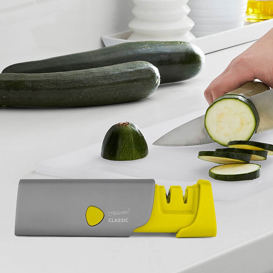 Точило для ножей Maestro MR-1491 имеет эргономичную форму и надёжную конструкцию, которая позволяет производить качественную заточку ножей в минимальные сроки. Рукоятка имеет противоскользящую поверхность, что обеспечивает вашу безопасность во время работы. Помимо отличных технических данных все кухонные приспособления обладают ярким и стильным дизайном.