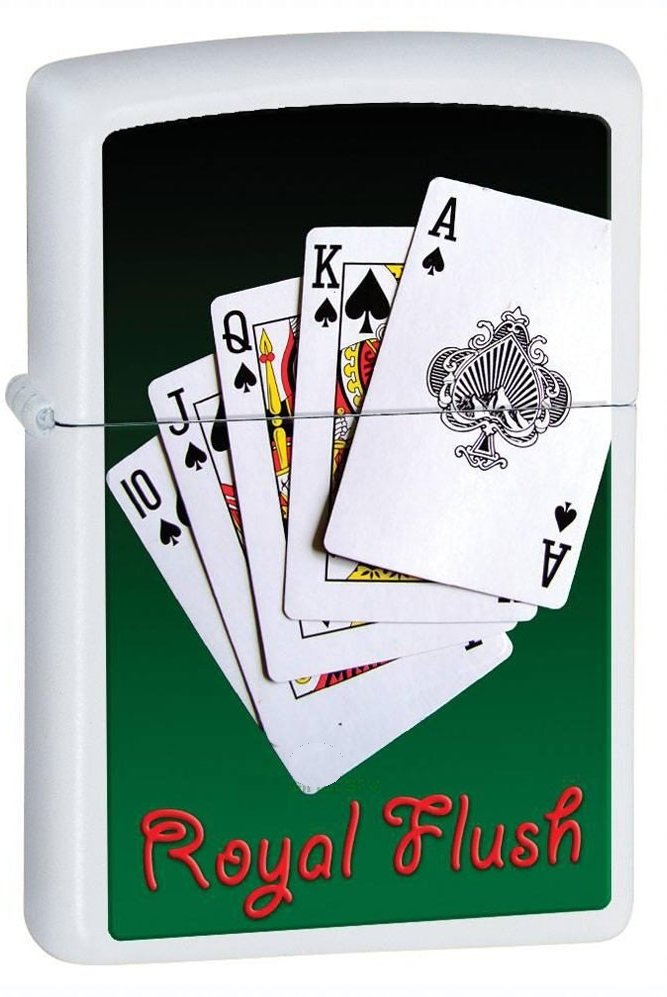 Зажигалка Zippo (Зиппо) 28038 новая модель 2014 года, которая уже весьма популярна в Европе. Данная модель сделана способом White Matte. Белый матовый цвет, которым покрыта вся поверхность зажигалки, достигается путём шлифования хромированного корпуса и окрашивания вакуумным способом. Такая поверхность очень прочная к истиранию и другим внешним повреждениям, цвет останется прочным спустя много лет использования. Знаменитая надпись ROYAL FLUSH (Королевский флэш) из карточной комбинации очень известна в определённых кругах. Такая замечательная модель станет потрясающим подарком и обрадует любого азартного игрока.