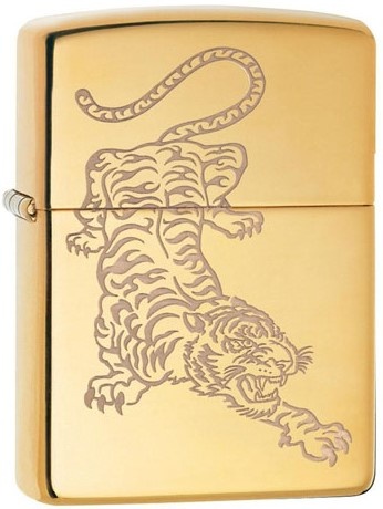 Данная модель представлена в очень привлекательном дизайне. Кроме того, что разработчики выполнили корпус из высококачественной латуни, которая играет при хорошем освещении, они еще и рисунок выполнили очень необычно. Агрессивный тигр украшает лицевую сторону зажигалки и если смотреть на рисунок на свету можно заметить, что он как будто плавает на поверхности зажигалки. Поставляется модель в фирменной упаковке Zippo.