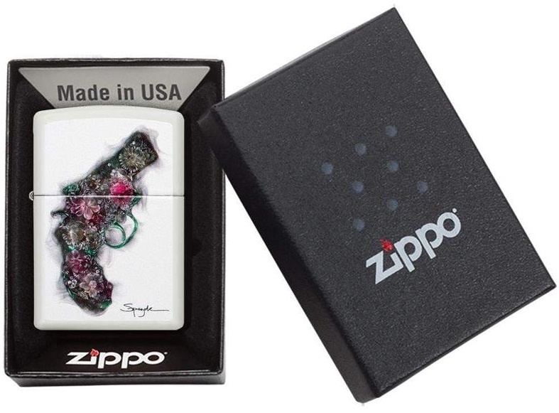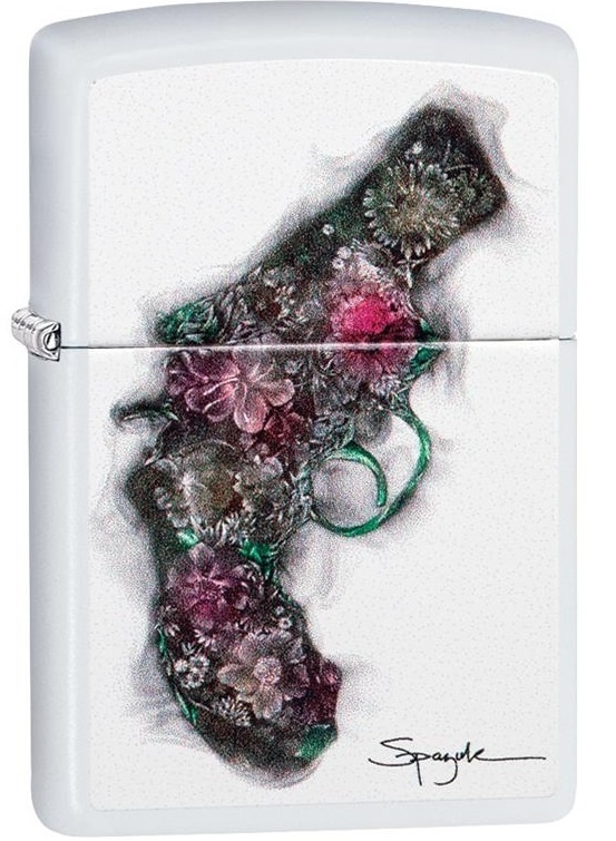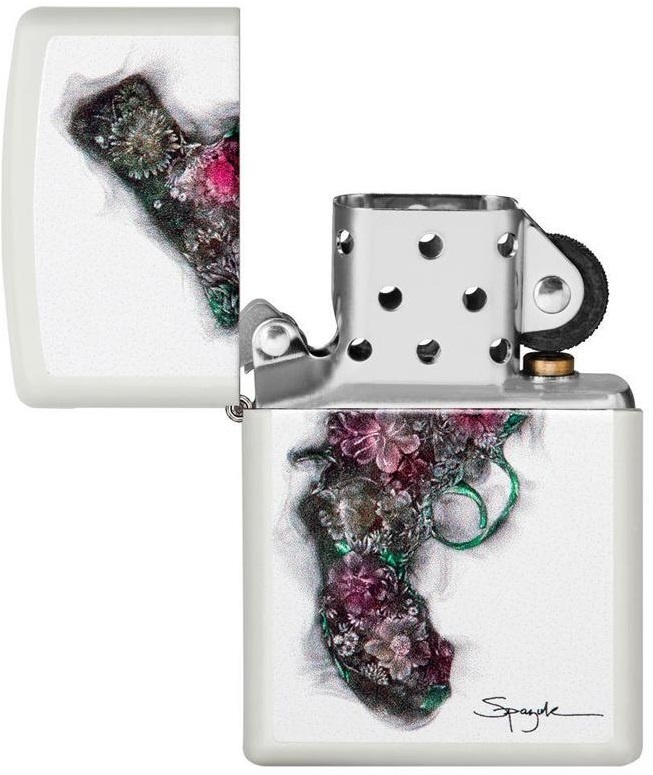 Всемирно известный мастер фьюмажа Стив Спазук умеет удивить сказочными, прорисованными до мельчайших деталей, картинками. Суть этой техники в том, чтобы рисовать на саже, которая появляется на бумаге, помещенной над открытым пламенем свечи или керасиновой лампы. Его создания словно проявляются из дымки, причем творения рук человеческих неожиданным образом сочетаются с красотой и пластикой природы. Здесь мы видим пистолет из разноплановых цветков, нанесенных на лицевую поверхность зажигалки White Matte. Поставляется в подарочной коробке. Для оптимальной работы рекомендуется использовать только оригинальное топливо Zippo.
