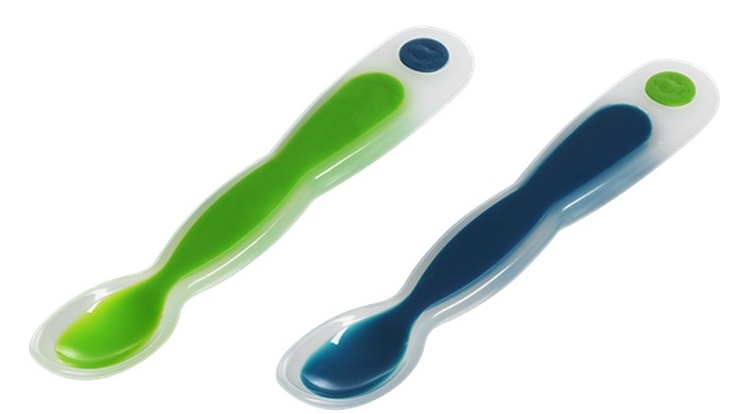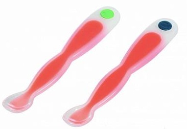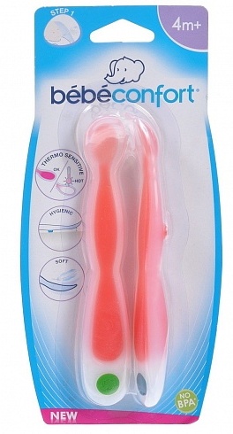 Ложки сенсорные Bebe Confort. Сенсорный участок ложек меняет цвет, если пища слишком горячая для ребенка. Опустите ложку в еду и помешивайте в течение 15 секунд. Если ложка поменяла цвет, то остудите еду и сполосните ложку холодной водой. Повторяйте до тех пор, пока ложка не перестанет менять цвет. Мягкие края ложечки защищают десны и зубки малыша от случайного повреждения. Изделие изготовлено из безопасных и нетоксичных материалов. В комплекте 2 шт.