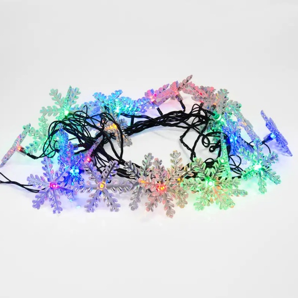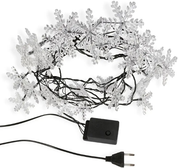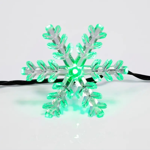 Светодиодная гирлянда «Снежинки» длиной 4,4 метра — идеальное решение для украшения новогодней ели. Прозрачные реалистичные насадки-снежинки ярко подсвечиваются разными цветами. 30 светодиодов расположены по всей длине шнура, скрытого в изоляции из зеленого ПВХ. Гирлянда имеет степень защиты IP20 и предназначена для использования в интерьере и сухих помещениях с умеренной влажностью. Гирлянда питается от электросети с напряжением до 230 Вольт.