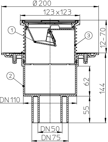 Трап с решеткой 115*115 мм в подрамнике 123*123 мм, незамерзающим затвором для предотвращения проникновения запаха, с вертикальным выпуском.