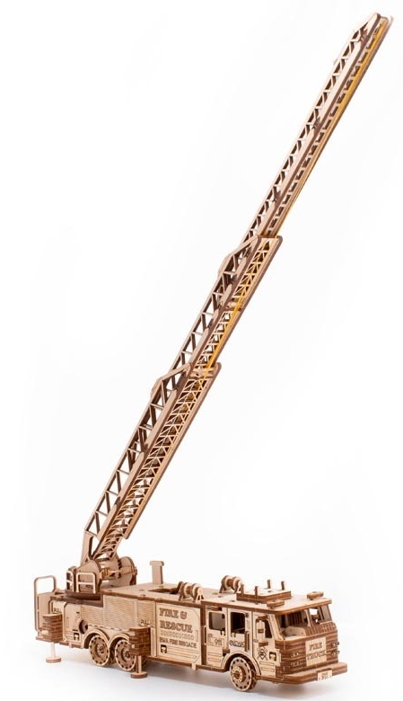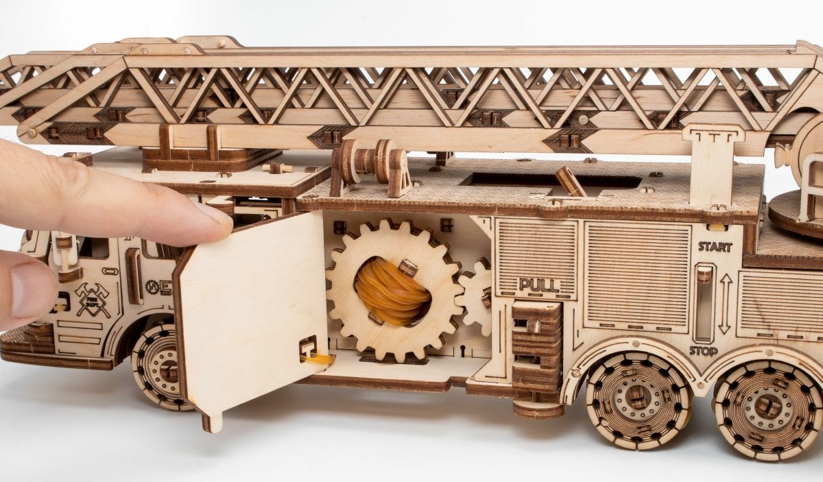 Механическая деревянная сборная модель Пожарной машины от EWA (Eco-Wood-Art) имеет заводной механизм на резинке с ключом, выдвижную и вращающуюся пожарную лестницу, вращающиеся передние колёса и открывающиеся передние двери, а также выдвижные стопоры для грузовиков.