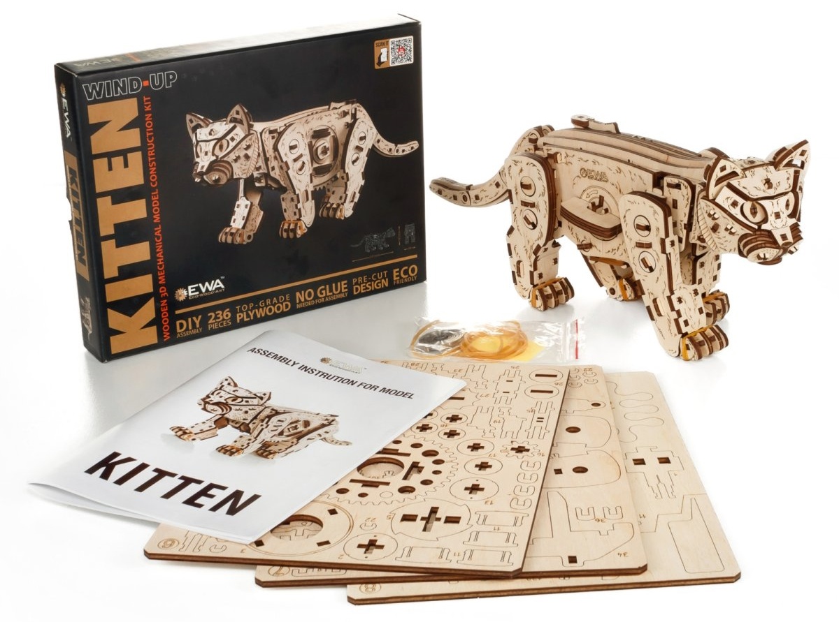 Механическая сборная модель из дерева отличный подарок как для ребенка, так и для взрослого человека, который увлекается конструированием и моделированием. У модели имеется пружинный мотор на механическом заводе. После сборки конструктора, заведите его, и он начнет шагать, словно настоящий живой котенок! Деревянный механический конструктор в виде кота -альтернатива заведению домашнего питомца (никаких забот, а ребенок счастлив). Собирайте его вместе с детьми или наслаждайтесь процессом сами — это отличный способ провести время весело и познавательно. Деревянный конструктор станет прекрасным украшением для вашего дома или офиса.