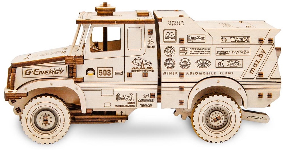 Масштабная модель 1:30. Сборная механическая полнофункциональная коллекционная модель, которая движется за счет чистой механики на резиномоторе. Точная копия настоящего МАЗ-6440RR — спортивного автомобиля, воспроизведенная по специальному заказу ОАО "Минский автомобильный завод".