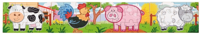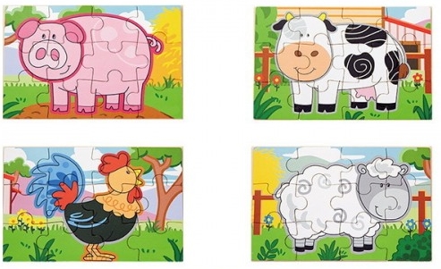 Набор содержит 4 отдельных деревянных пазла с изображениями фермерских животных. Их можно собирать отдельно либо соединить в один большой пазл. Комплект содержит 48 элементов.