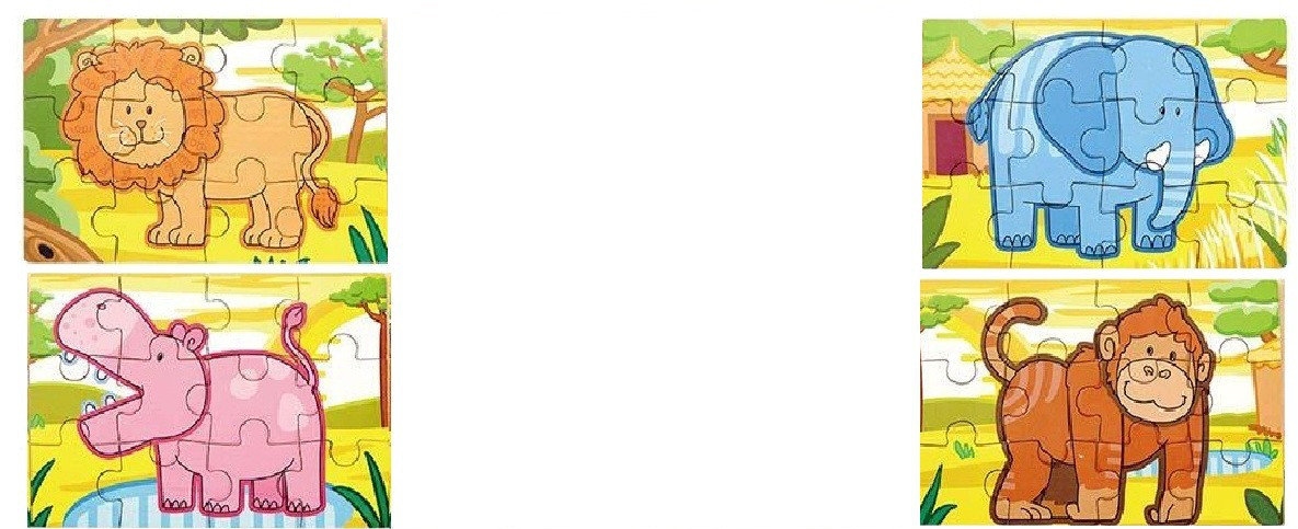 В коробке 4 красочных деревянных пазла с изображениями африканских животных. Их можно собирать отдельно либо соединить в один большой пазл. Комплект содержит 48 элементов.