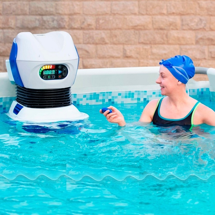 Беспроводной пульт можно зафиксировать на запястье и с легкостью переключать скорость потока воды, пока вы плывете. Также имеется встроенный светодиодный светильник, который позволяет купаться даже в темное время суток.