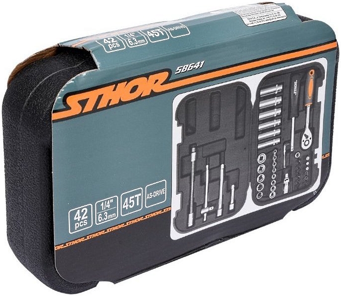 Набор инструментов STHOR содержит 42 предмета присоединительного размера 1/4 дюйма для работы с резьбовыми соединениями. Головки, биты и держатели изготовлены из инструментальной хромованадиевой стали CrV50BV30. Разработан для применения в автомастерских и сервисах, а значит, при использовании частным мастером намного перекроет его потребности в качественном инструменте. Все инструменты размещены в прочном пластиковом кейсе для удобства хранения и транспортировки.