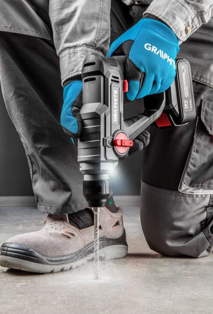 Перфоратор SDS-plus GRAPHITE, работающий с аккумуляторными батареями 18 В Li-Ion GRAPHITE Energy+. Имеет 2 функции: сверление и сверление с электропневматическим ударом. Конструкция перфоратора отличается компактной формой, по размерам похожей на дрель-шуруповерт, а также небольшим весом. Электроинструмент обеспечивает энергию удара 0,8 Дж, которая является оптимальной в том числе и для сверления в более твердых строительных материалах. Частота удара составляет 0-5000 мин⁻¹, а скорость вращения 0-900 мин⁻¹. Максимальный диаметр просверливаемых отверстий в бетоне составляет 26 мм, в стали — 8 мм, а в древесине — 16 мм. Перфоратор с возможностью изменения направления вращения шпинделя, с функцией ступенчатой регулировки скорости кнопкой включения. Обеспечена подсветка рабочего места светодиодом. Перфоратор с функцией «click», обеспечивающей быстрое крепление сверла. Главная рукоятка с антискользящей накладкой, благодаря чему электроинструмент хорошо ложиться в ладонь.