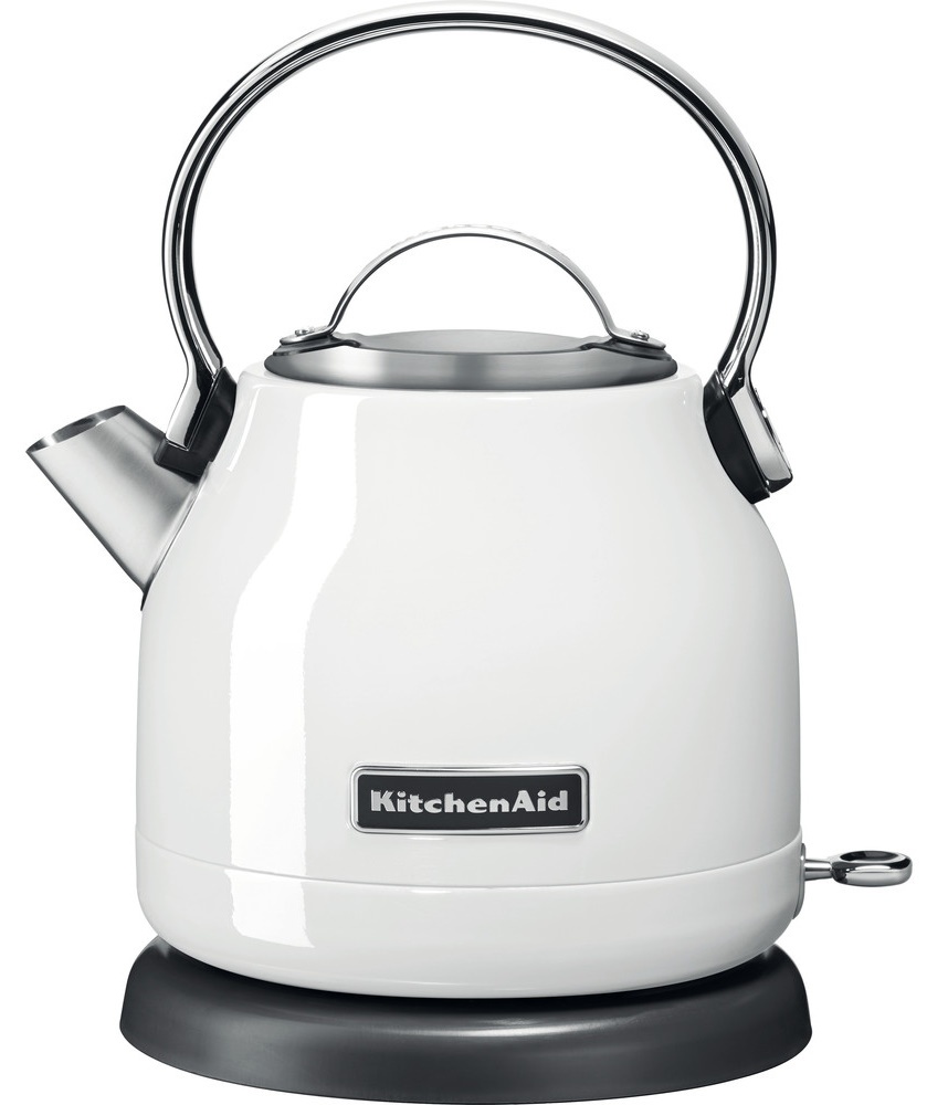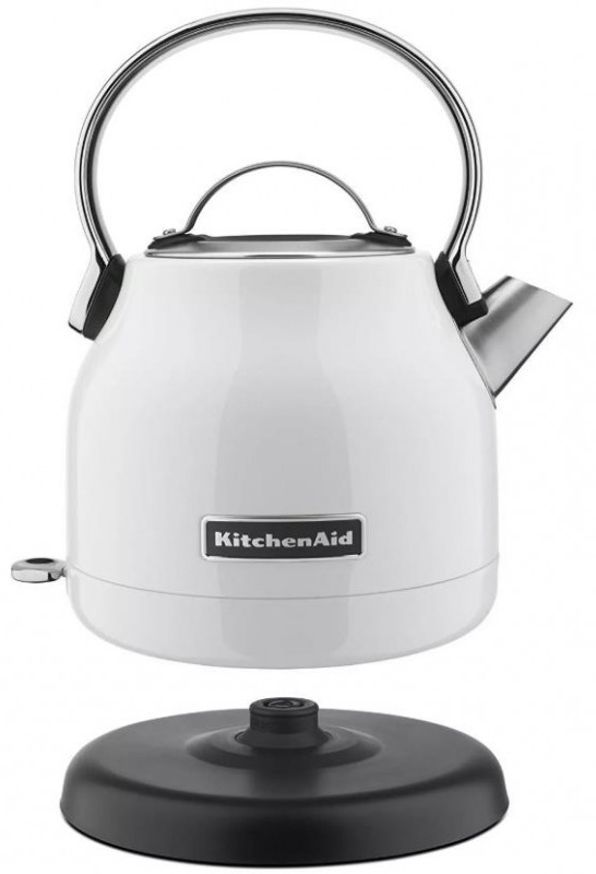 Электрочайник КитченЭйд выполнен в объеме 1,25 л, он устанавливается на круглую подставку и занимает минимум места. Его можно взять для обустройства рабочего места, использовать на даче или в другом помещении. Но особенно красиво он смотрится на дизайнерской кухне в сочетании с другими приборами американского бренда.