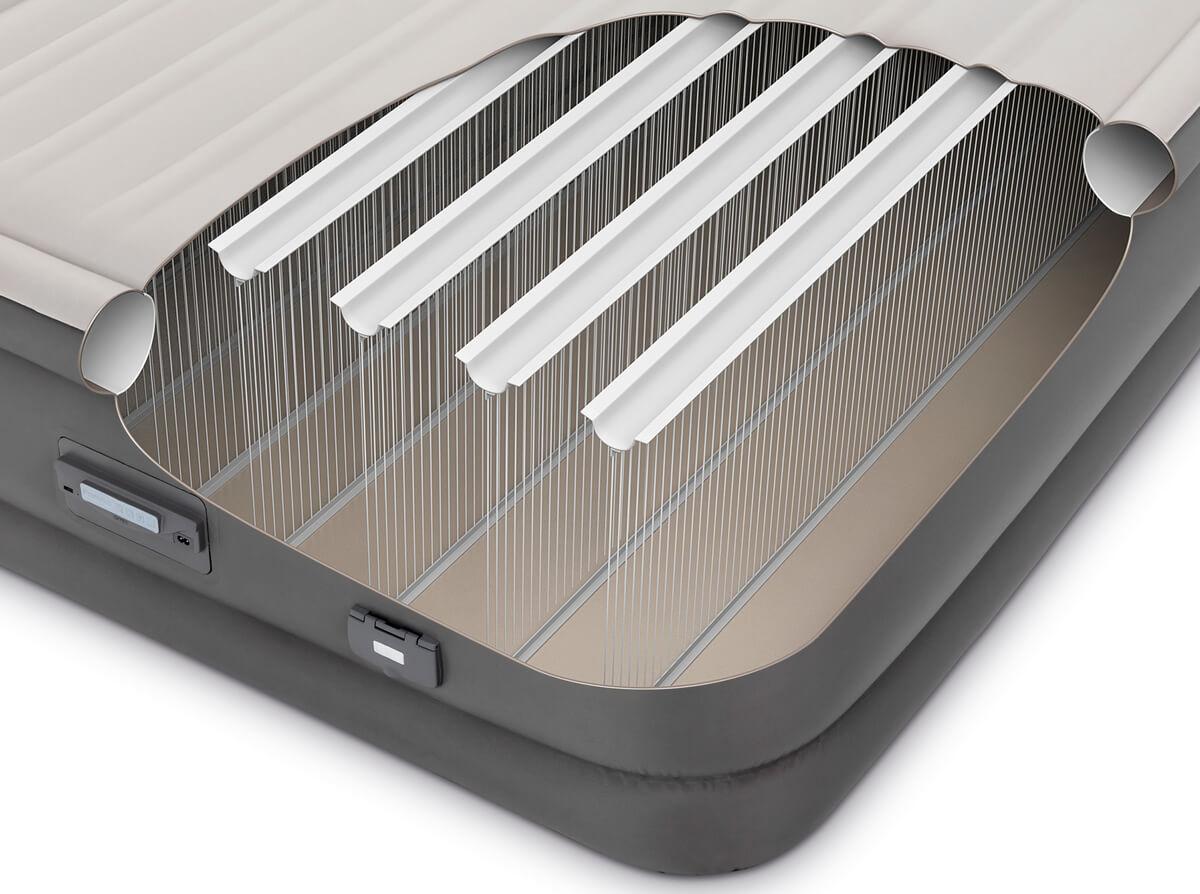 Надувная двуспальная кровать премиум класса серии PremAire II изготовлена по технологии Fiber-Tech. Внутренние перегородки сделаны из множества полиэфирных волокон, за счет чего кровать становится намного прочнее и легче. Поперечное расположение ребер жесткости придает кровати необходимую твердость и упругость. Благодаря новой технологии практически исключен разрыв внутренних перегородок, кровать стала устойчивой и стабильной, значительно выросла надежность и долговечность изделия. Низ и бока кровати имеют дополнительный защитный слой (похожий на ткань), предохраняющий кровать от механических повреждений. Верхний слой кровати так же имеет дополнительный слой, состоящий из множества воздушных карманов , что обеспечивает невероятный комфорт для отдыха и сна. Флокированное покрытие кровати не даёт соскальзывать белью, и в тоже время легко чистится. Встроенный электронасос позволяет быстро надувать и сдувать кровать и дает возможность отрегулировать ее упругость. Чтобы отрегулировать степень упругости кровати, на моторном отсеке присутствует специальная кнопка. Так же на моторном отсеке установлен разъем USB, с помощью которого можно заряжать телефон и LED подсветка, которая позволяет с комфортом пользоваться кроватью в темное время суток. При отсутствии электричества, кровать можно накачать механическим насосом. Справа от панели управления насосом расположен дополнительный клапан 2-в-1 для подключения механического насоса. В комплект входит сумка для переноски кровати и самоклеющаяся заплатка.