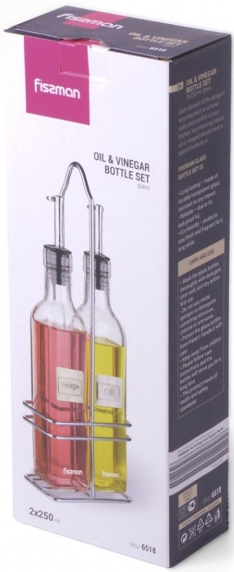 Корпус бутылочек изготовлен из высококачественного стекла, устойчивого к механическим повреждениям. Изящная хромированная подставка удобна для переноски и сервировки стола. Благодаря дозатору можно быстро налить необходимое количество масла или уксуса, а жидкость не будет течь по горлышку и оставлять пятна на поверхности. Крышка на дозаторе плотно прилегает и не дает растекаться жидкости при опрокидывании бутылочки, а также не пропускает воздух и предотвращает процесс окисления.