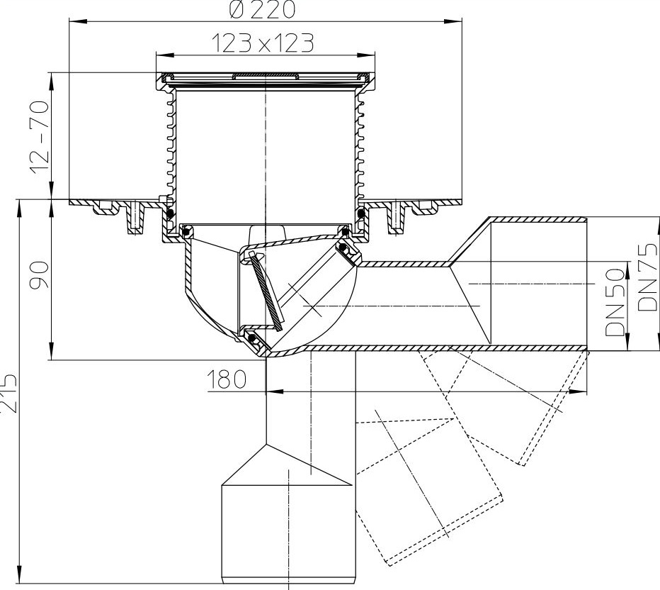Трап для балконов и террас DN50/75 с обжимным фланцем, поворотный