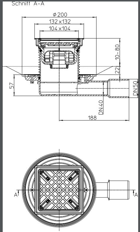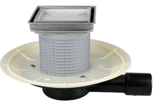 Трап с надставным элиментом с подрамником 132х132 мм и вкладышем 112х112 мм для вклеивания керамической плитки, с "сухим" сифоном "Primus". Монтажная высота надставного элемента от 10 до 80 мм, с горизонтальным выпуском.