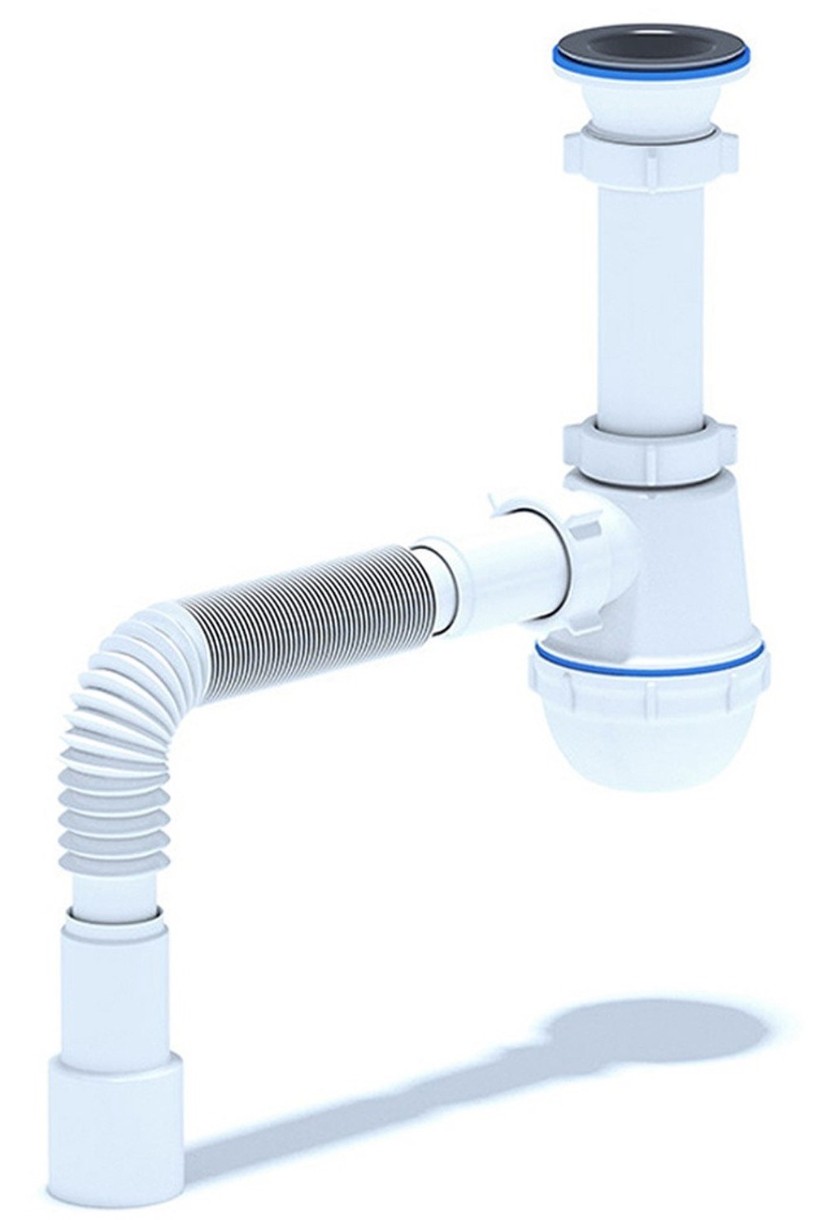 Сифон для кухонной мойки с диаметром сливного отверстия 50мм, бутылочного типа с увеличенным корпусом. С литым выпуском и нержавеющей решеткой. С отводом для стиральной машины, для подключения к канализации комплектуется гибкой трубой 40*40/50мм