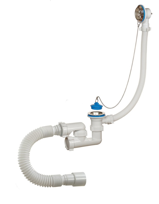 Сифон 1 1/2"х40, с переливом и нержавеющими чашками, для ванн и глубоких душевых поддонов. Конструкция сифона позволяет прочищать сифон, не демонтируя. В комплекте латунная цепочка с пробкой. Отвод в канализацию гибкая труба 40 – 40/50.