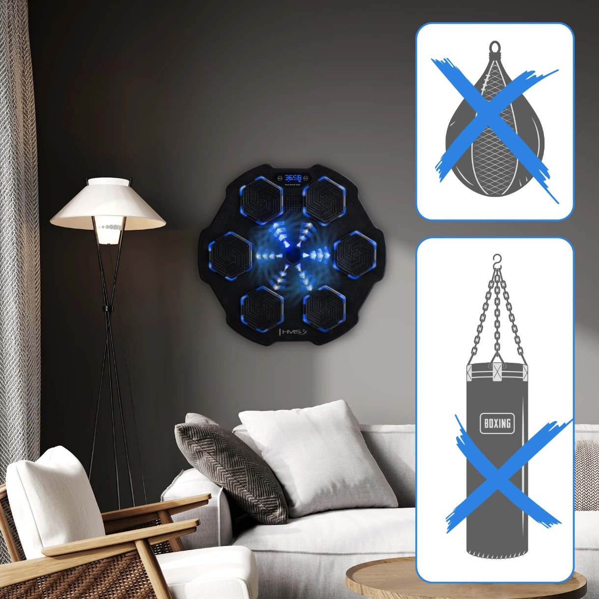 Диск должен быть закреплен на прочной стене с помощью винтов или липучки, что позволяет быстро разместить его в любом месте. Это делает устройство идеальным для домашнего использования. Инновационный боксёрский щит Bluetooth от HMS — отличная альтернатива боксерским мешкам, которые неоправданно занимают много места.
