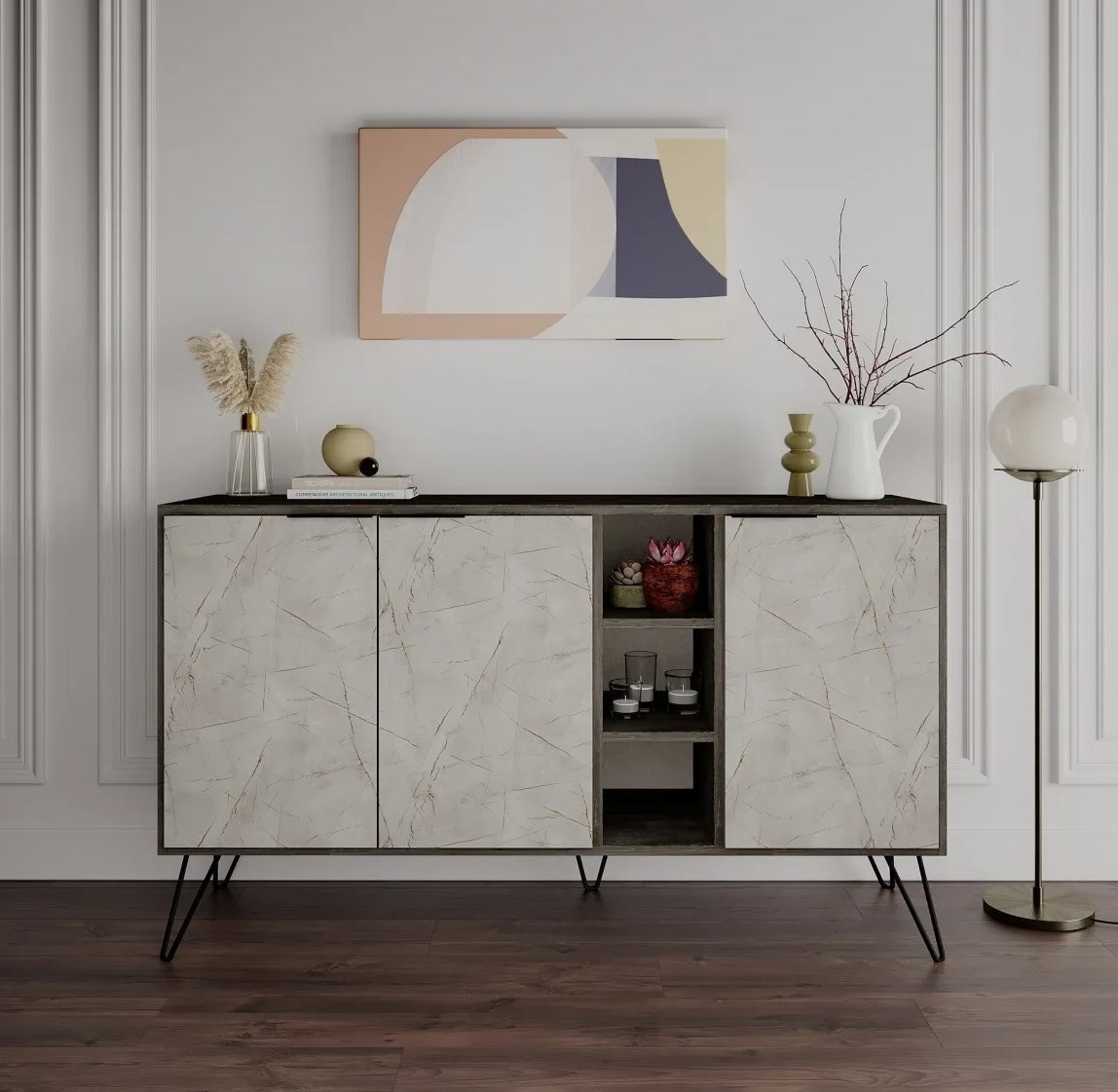 Размеры консоли — 142 см в ширину, 83 см в высоту и 35,6 см в глубину — делают её идеальным решением для любой комнаты. Высота ножек 20 см создаёт ощущение лёгкости и визуально увеличивает пространство. Кроме того, консоль можно легко закрепить на стене, что позволяет сэкономить ценное место на полу.