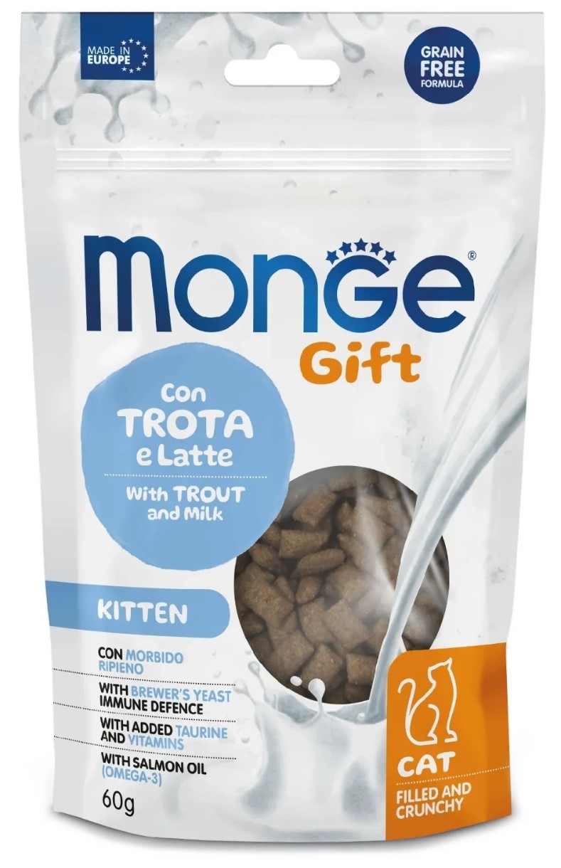 MONGE GIFT KITTEN WITH TROUT AND MILK хрустящие подушечки для котят форель/молоко являются дополнительным кормом для растущих котят. Специально разработан для хорошего самочувствия вашего котенка благодаря внешнему хрустящему слою, поддерживающему гигиену зубов, и мягкому молочному наполнителю, источнику минералов, полезных для роста. Продукт разработан без злаков и с форелью для улучшения вкусовых качеств и усвояемости пищи. Формула обогащена таурином для развития зрительной и нервной системы и витаминами для ежедневного бодрствования. Включение функциональных ингредиентов, таких как пивные дрожжи для поддержки системы защиты организма и масло лосося, источник омега-3, является результатом исследований «Сделано в Италии». Без добавления искусственных консервантов и сахара.