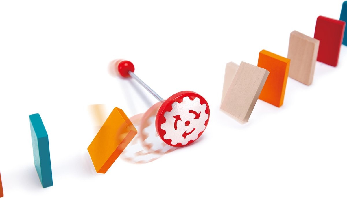 Захватывающий эффект домино: колесо импульса, костяшки и деревянный шарик передают движение до самого конца.