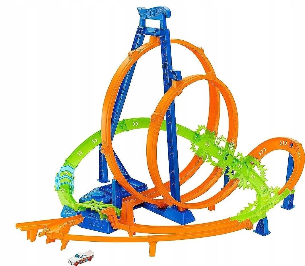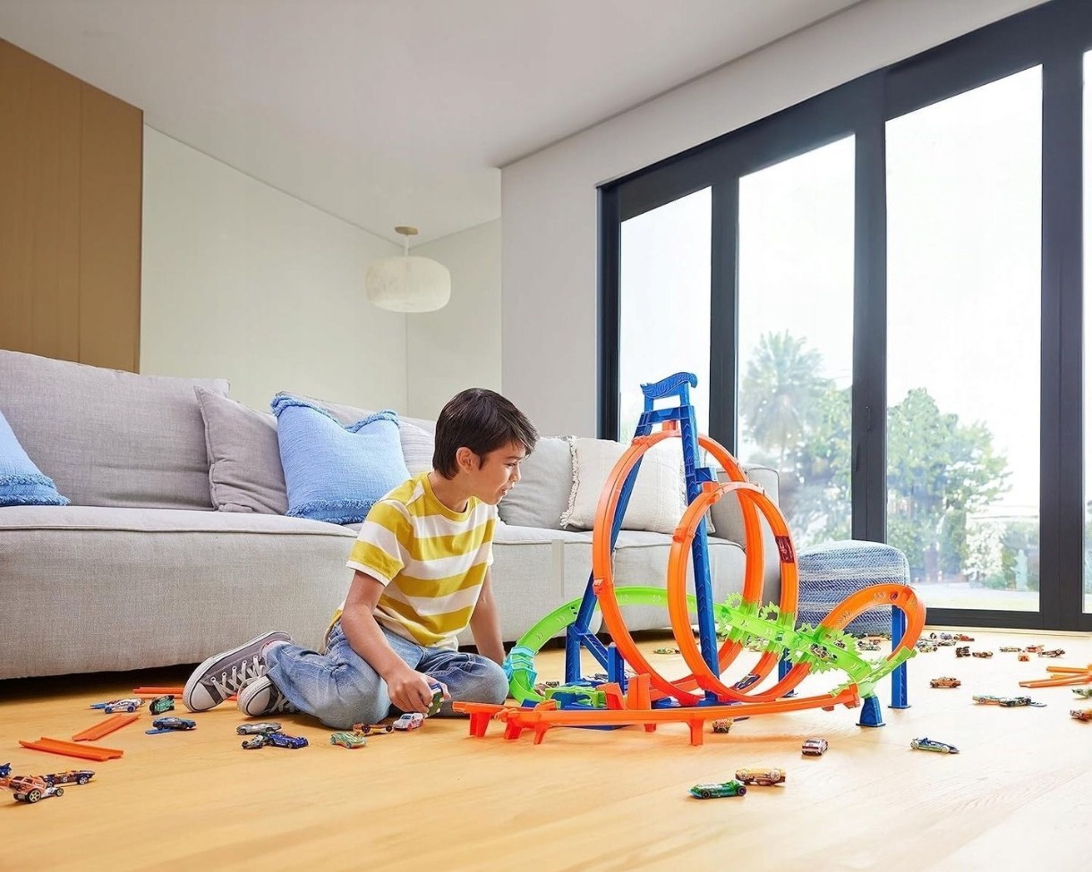 В комплект входит 1 машинка Hot Wheels, но сложность и веселье заключаются в том, что ты можешь запустить на трек столько машин, сколько сможет передвигаться по кругу без эпических аварий.