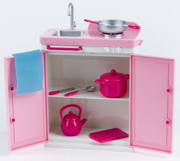 Дополнительные аксессуары: тумба с раковиной и газовым баллоном, скатерть, кастрюля, сковорода, чайник, разделочная доска, набор столовых приборов.