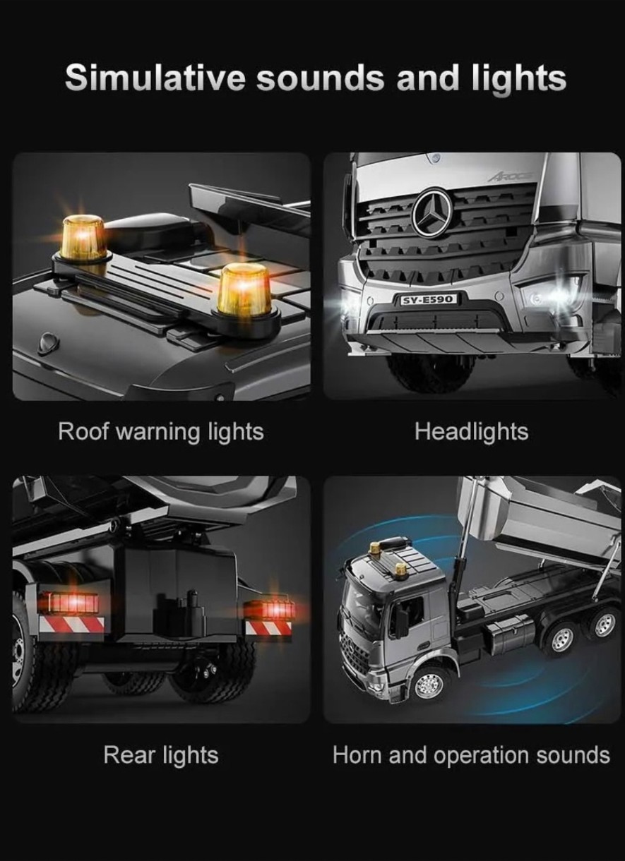 Радиоуправляемый самосвал Mercedes-Benz Arocs от Double Eagle в масштабе 1:20. Высокая степень детализации. Оснащён подъёмным кузовом