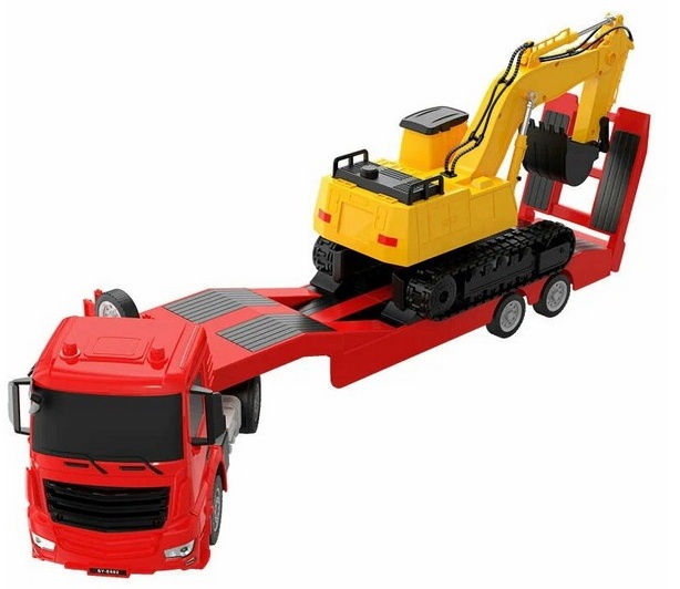Радиоуправляемый тягач с тралом Double Eagle Mercedes-Benz Aroсs в масштабе 1/26. Комбинация бортового прицепа и экскаватора с дистанционным управлением. Прицеп можно отцепить от тягача. Хвостовая пластина может быть опущена/убрана вручную. Манипулятор экскаватора с ковшом подвижный, кабина поворачивается. Частота 2,4 ГГц с защитой от помех позволяет играть с несколькими автомобилями.