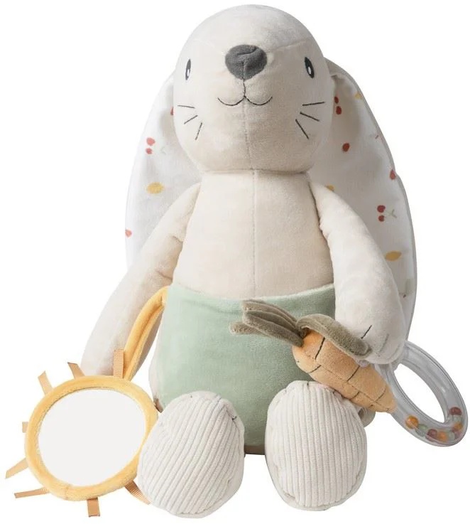 Превратите каждый момент в сенсорное приключение с этим зайчиком с активностями из коллекции La Vie à la Ferme. Созданный специально для стимуляции чувств малыша, он оснащён большими мягкими ушками, которые приятно трогать, а также тактильными и звуковыми сюрпризами, пробуждающими любопытство ребёнка.