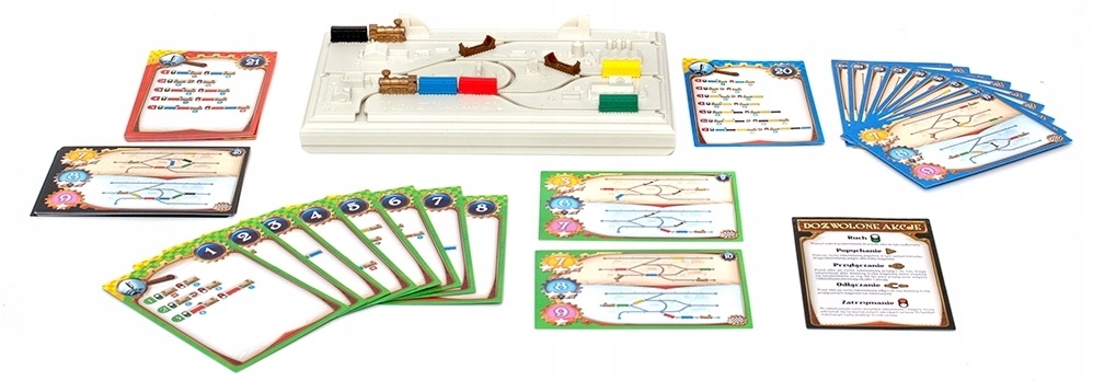 Комплектацияскладной чехол и доска, 40 карт-пазлов, карточка железнодорожной станции, 2 локомотива, 5 вагонов поезда (1 синий, 1 красный, 1 зеленый, 1 желтый, 1 черный), 2 сломанных пути, правила