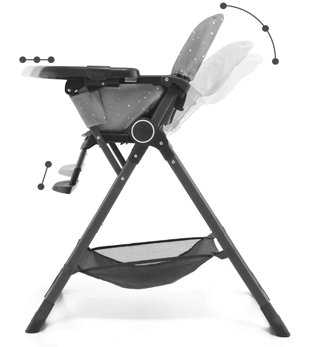 Регулируемый поднос. Foldee оснащен регулируемым двойным подносом. Высота подноса может быть легко настроена на трех уровнях относительно сиденья. Поднос легко снимается и моется под проточной водой. Он также имеет подстаканник, который предотвращает разливание напитков. Поднос Foldee прошел проверку и допущен к контакту с пищевыми продуктами.
