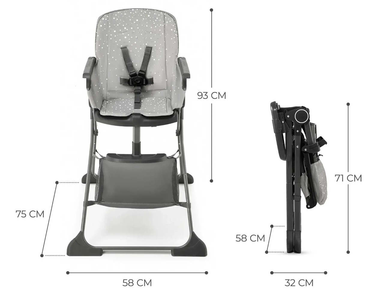 Легкая переноска. Специальная ручка обеспечивает удобную одноручную переноску стульчика для кормления. Независимо от того, где твой ребенок предпочитает есть — на кухне или в гостиной, переносить Foldee из одной комнаты в другую не составит проблемы. Благодаря компактным размерам в сложенном виде, его также можно взять с собой в поездку.