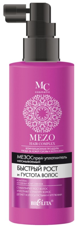 Мезоспрей-уплотнитель — многофункциональное средство, предназначенное для ухода за волосами во время их активного роста, которое кондиционирует волосы, облегчает расчесывание мокрых и сухих волос. Благодаря активным компонентам формула спрея способствует укреплению волосяных луковиц, восстановлению липидного слоя волос, выравниванию кутикулы волос, увлажнению и уплотнению структуры волос по всей длине.